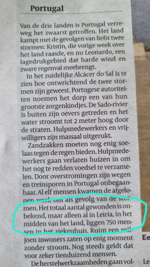 Leiria de Portugese partnerstad van Rheine is ernstig getroffen door het noodweer dat de laatste weken Spanje en Portugal teistert. Zie foto’s Portugese krant via link. In Rheine is al een noodhulp actie gestart. Meer valt hierover te lezen in de onderstaande oproep namens de burgemeester van Rheine. De foto’s laten o.a. zien hoe het stadion, waar het Nederlands elftal ooit al eens heeft gespeeld, er nu bij ligt. Er is een bankrekening geopend voor hulp aan de getroffenen. Een bijdrage kan op de volgende bankrekening worden overgemaakt. t.n.v. Rheine hilft Leiria ,IBANDE 44 4035 0005 0000 0708 39